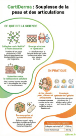 CartiDerma est un complexe qui associe le collagène à l’acide hyaluronique, aux bienfaits hydratants et anti-âge, pour optimiser les actifs de cette protéine. En effet, l’acide hyaluronique maintient une bonne hydratation, donc l’élasticité de la peau, soutient la production de liquide synovial, agissant dans la lubrification des articulations, et enfin favorise la synthèse du collagène par notre corps.